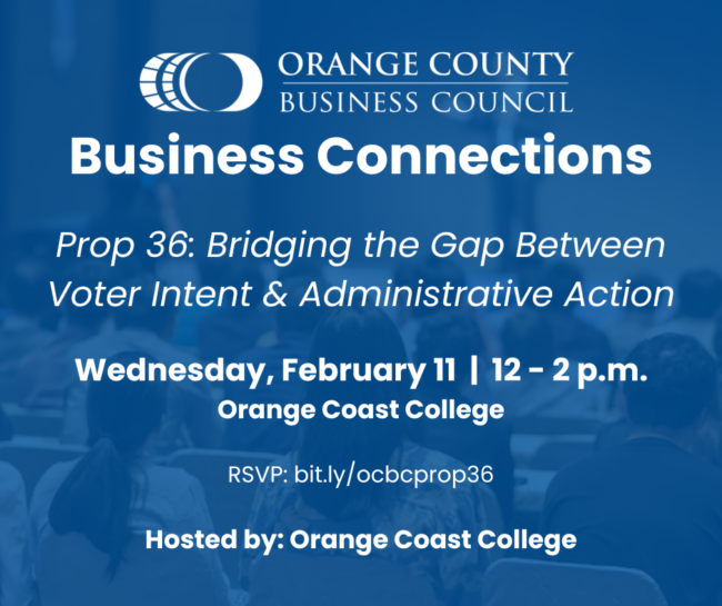 Public safety and quality of life are essential to a strong business climate, and California voters made their expectations clear with the passage of Proposition 36 in 2024. Join Orange County Business Council on Wednesday, February 11, from 12 PM – 2 PM (PST) at Orange Coast College for a timely discussion on the implementation process of Prop 36 and the growing gap between voter intent and state action, as the law moves forward without sufficient funding to support enforcement and local implementation.