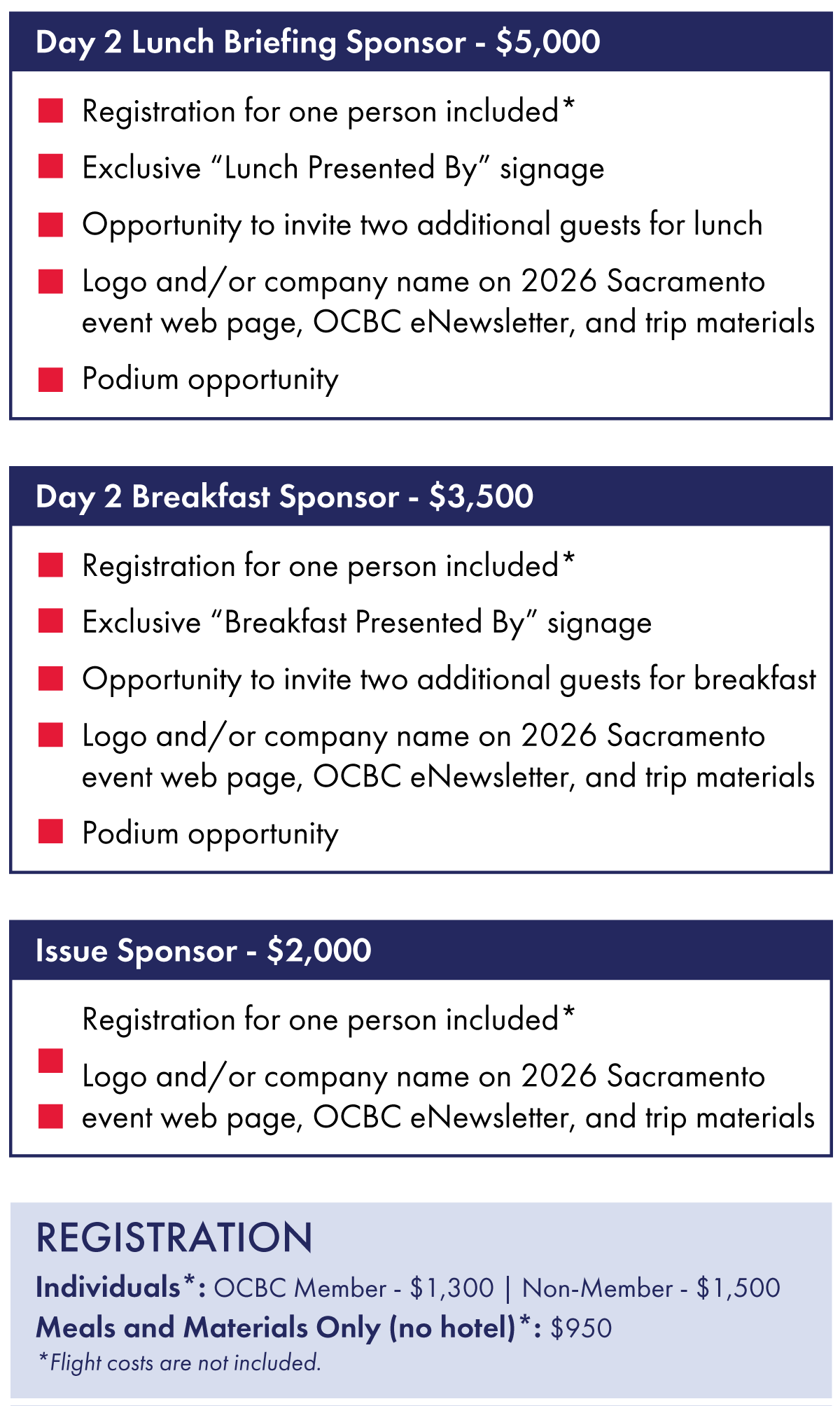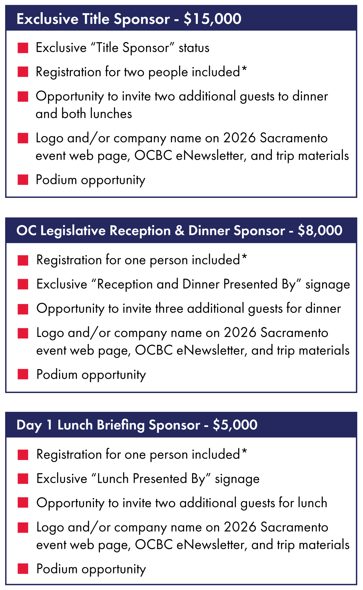 Sold Out Sponsorships: Title Sponsor, OC Legislative Reception Dinner Sponsor, Day 1 Lunch Sponsor, Breakfast Sponsor